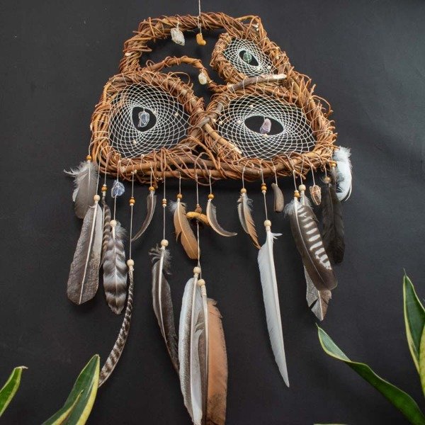 Este colgante de pared hecho a mano, inspirado en los atrapasueños, está hecho con madera de sauce natural, hilo, plumas y piedras semipreciosas. Su diseño único presenta tres redes interconectadas en una sola estructura, creando una pieza armoniosa y protectora para tu hogar. Ideal para quienes buscan limpieza energética, equilibrio espiritual y una estética boho mística. Perfecto para dormitorios, espacios de meditación o entornos de sanación. Cada pieza está hecha a mano y es única, elaborada con materiales naturales cuidadosamente seleccionados para brindar belleza y protección.